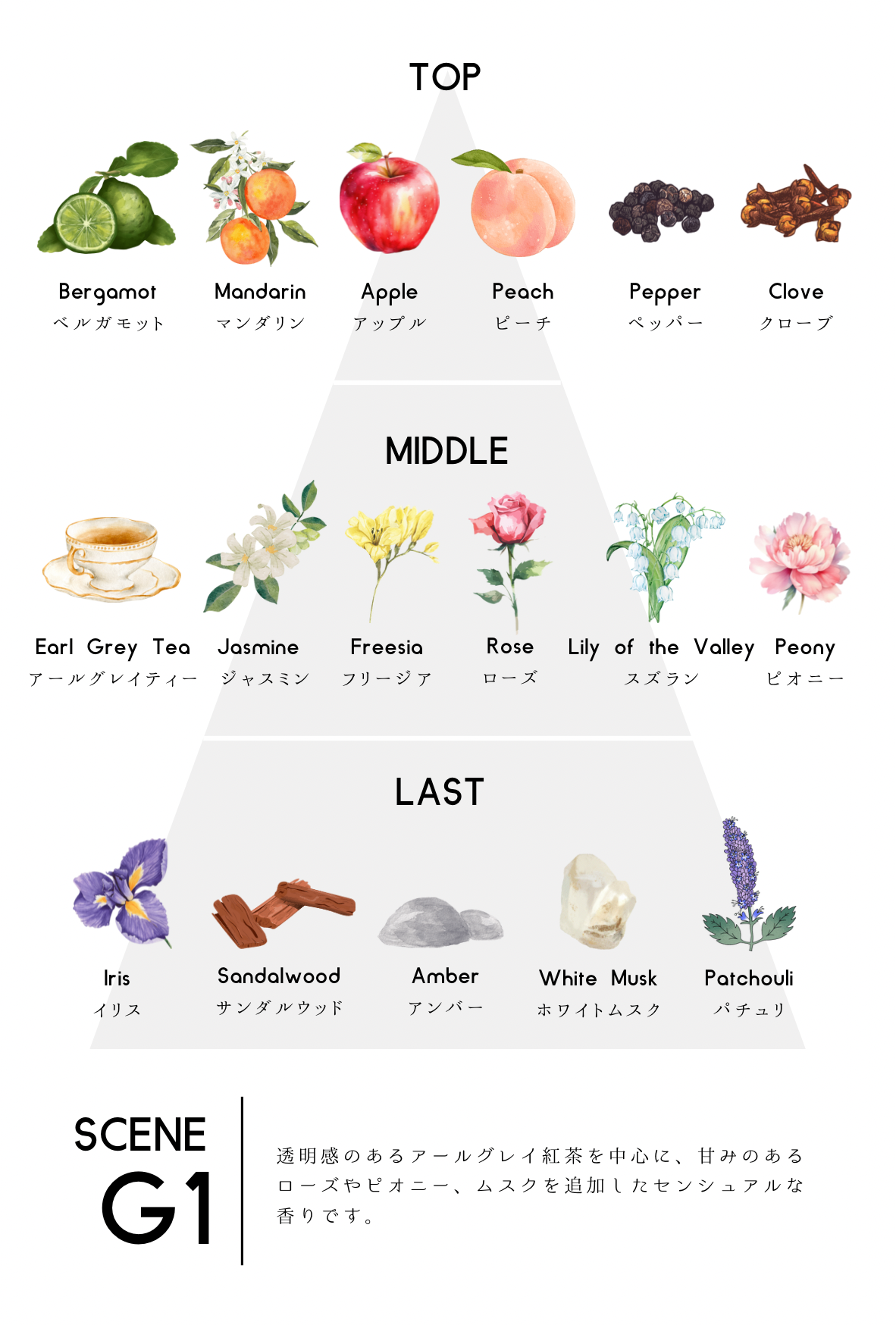 トップ:ベルガモット、マンダリン、アップル、ピーチ、ペッパー、クローブ